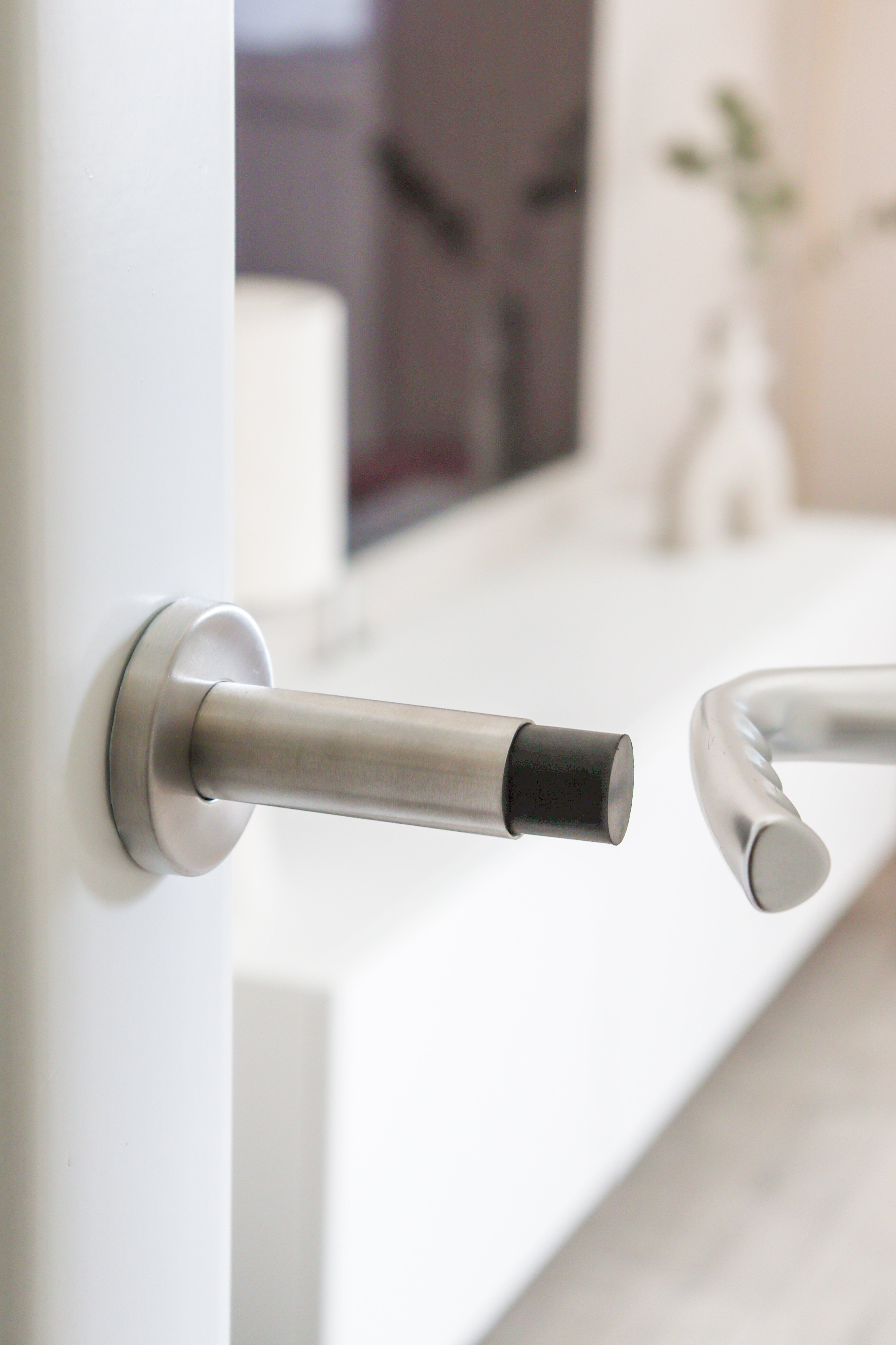 Die Installation ist schnell und einfach und sorgt für ein elegantes, sauberes Erscheinungsbild. Dieser Türstopper wird mit verdeckter Befestigung geliefert. Stecken Sie einfach die mitgelieferten Dübel und Schrauben in die Wand, und die Rosette gleitet sanft darüber. Es sind keine Schrauben sichtbar; nur ein minimalistisches, fertiges Design.