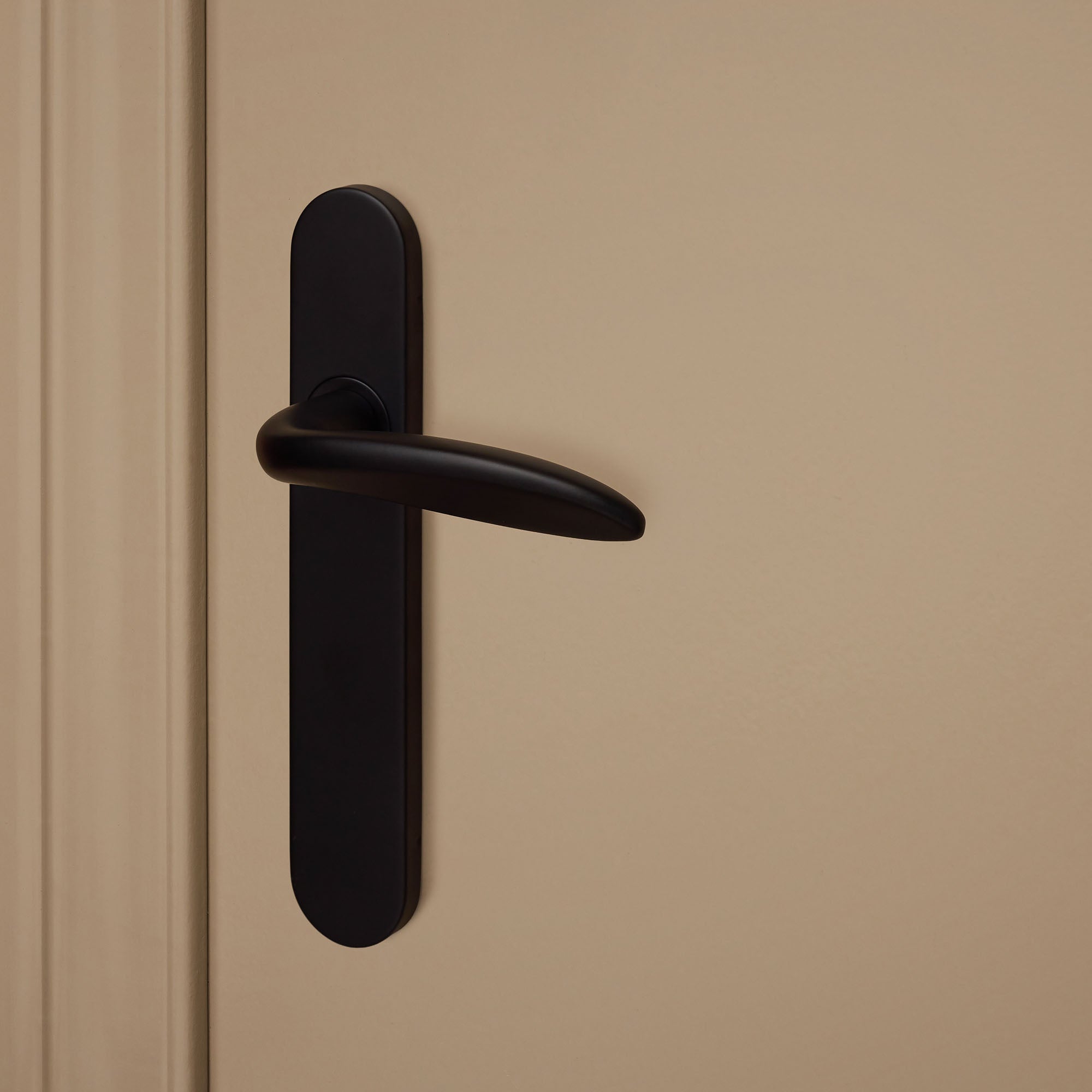 Dank seiner mattschwarzen Oberfläche und der abgerundeten Formgebung strahlt dieser Türgriff Ruhe und Charakter zugleich aus. Die abgerundete Rosette sorgt für einen harmonischen Übergang zur Tür. Die robuste und langlebige Oberfläche garantiert, dass der Griff über Jahre hinweg schön bleibt. Er liegt angenehm in der Hand und vereint elegante Linien mit einem modernen Look. Dadurch lässt er sich mühelos mit verschiedenen Einrichtungsstilen kombinieren – von japanisch und romantisch bis modern und eklektisch. Bitte beachten Sie: Diese Ausführung ist nur für Innentüren geeignet.