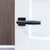 Moderner und eleganter schwarzer Türgriff mit quadratischer Rosette