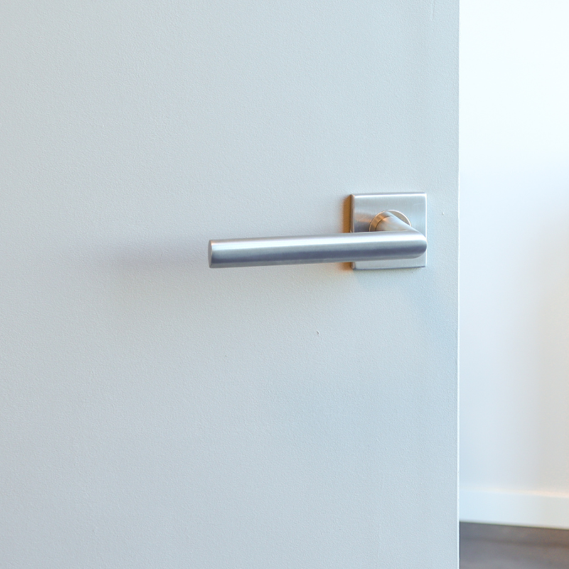 Diese Ausführung eignet sich für Innentüren ohne Schlüsselloch. Die quadratische Rosette ergänzt die geometrische Form des Griffs und sorgt für ein elegantes Finish. Die Edelstahloberfläche ist langlebig und lässt sich gut mit anderen Materialien im Wohnbereich kombinieren.