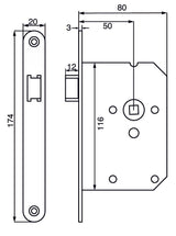 Die Frontplatte dieses Einsteckschlosses ist 174 mm lang und 20 mm breit. Die Ecken sind abgerundet, sodass sie direkt in die Aussparung Ihrer Tür passt!