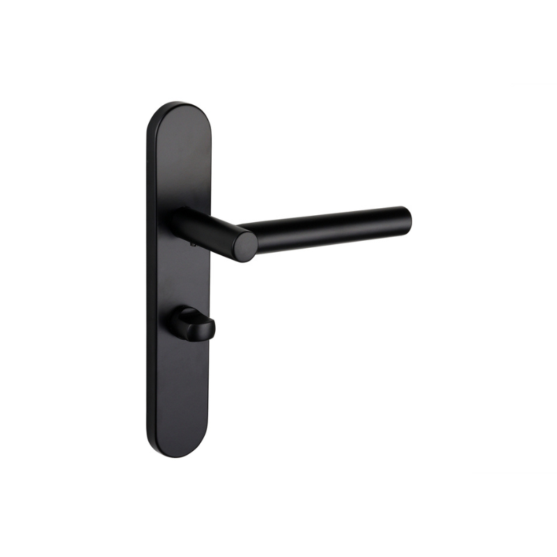 Diese Ausführung eignet sich für Innentüren mit einem Badezimmerschloss im Lochabstand von 63 mm (6 3/8 Zoll). Die Abdeckplatte deckt vorhandene Bohrlöcher sauber ab und schließt bündig mit der Tür ab. Die mattschwarze Pulverbeschichtung ist kratzfest, farbecht und leicht zu reinigen.