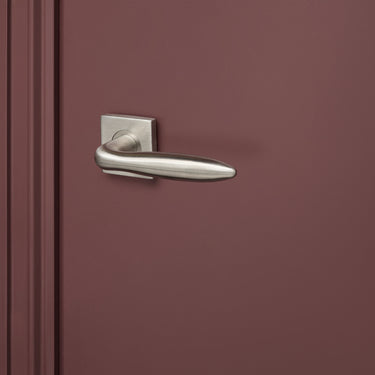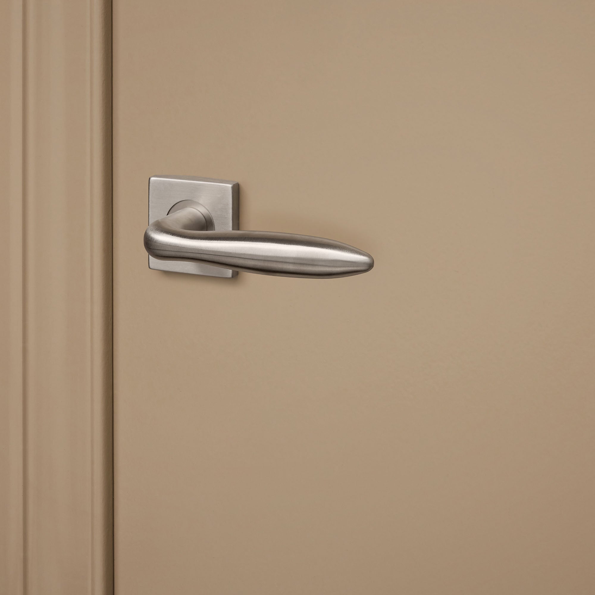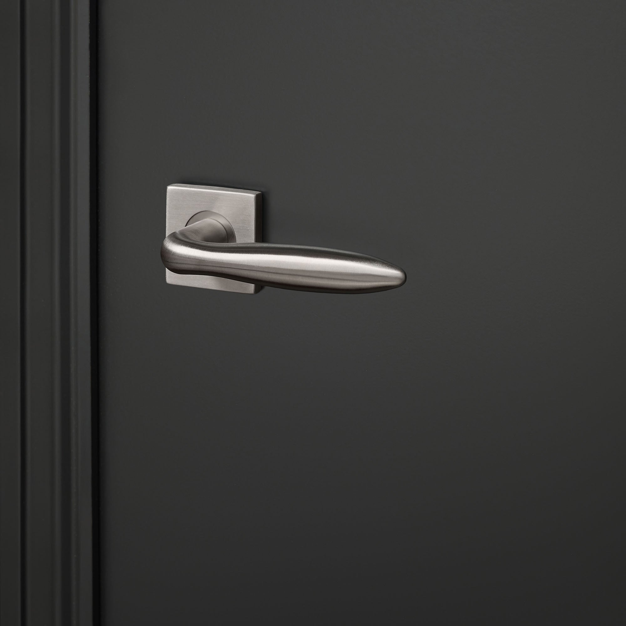 Der Griff besteht aus hochwertigem, gebürstetem Edelstahl und ist robust, pflegeleicht und zeitlos. Die Kombination aus rundem Griff und quadratischer Rosette erzeugt einen überraschenden Kontrast, der Ruhe und Stärke zugleich ausstrahlt.