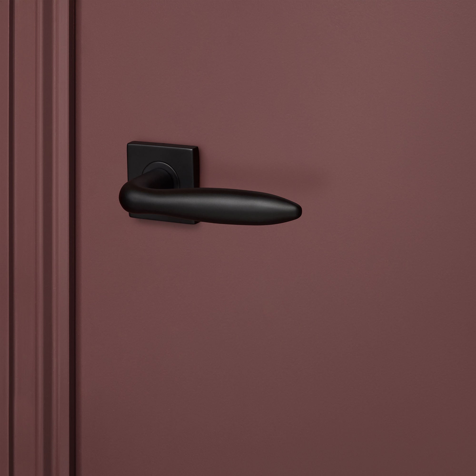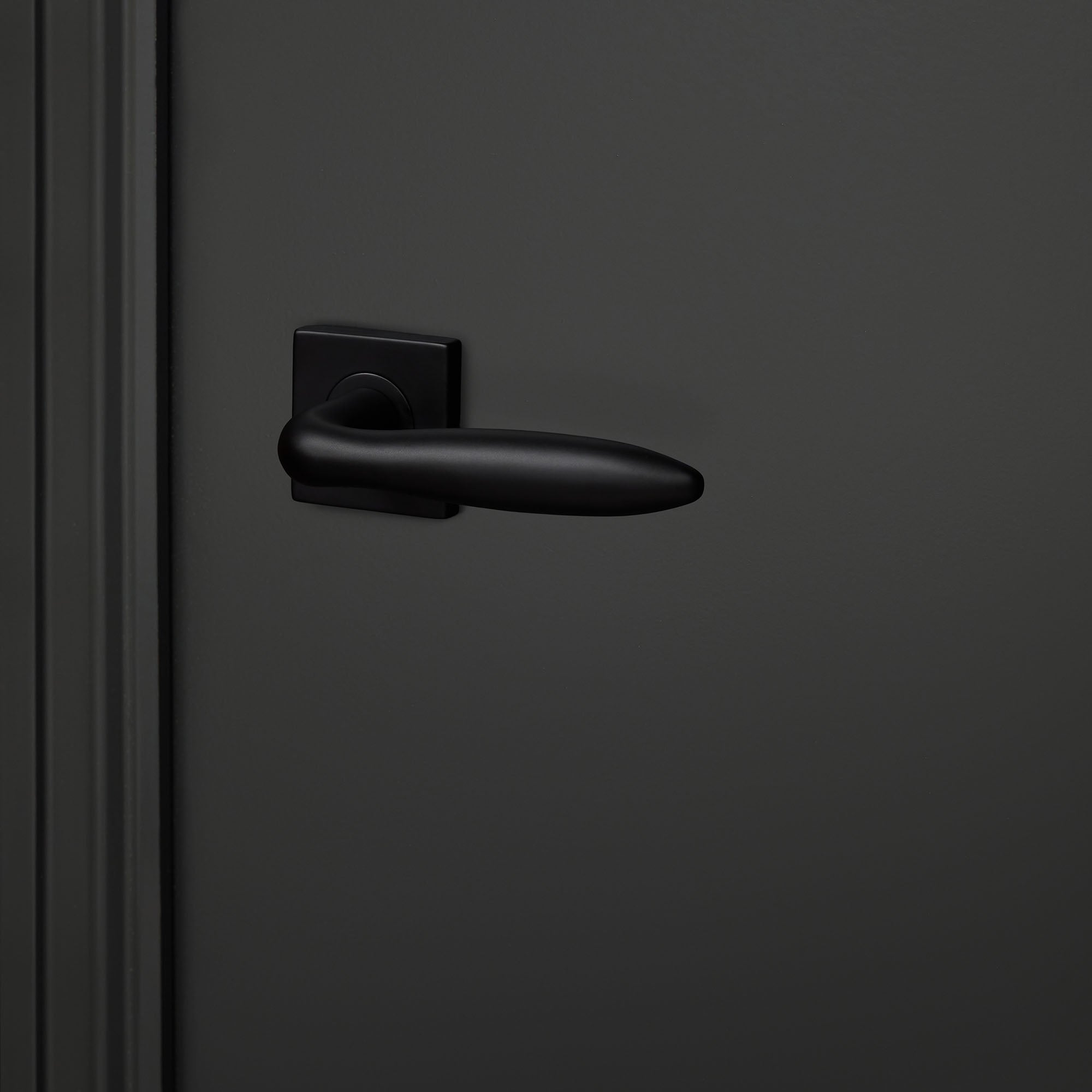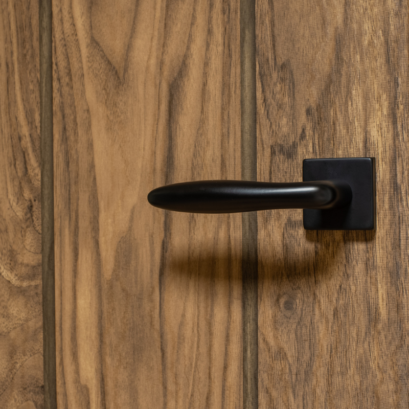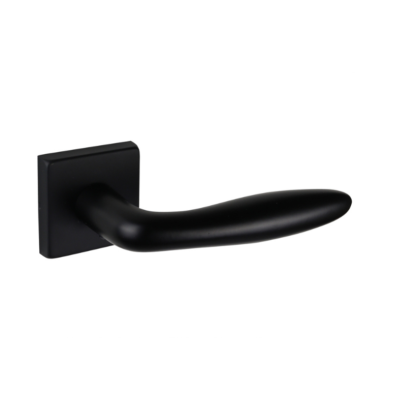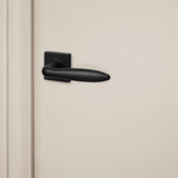 Der Türgriff Pratona mit quadratischer Rosette besticht durch sein elegantes, zigarrenförmiges Design in tiefem Mattschwarz. Die Kombination aus abgerundeten Formen und der schlanken, quadratischen Rosette erzeugt einen spannenden Kontrast, der Klasse und Stil ausstrahlt.