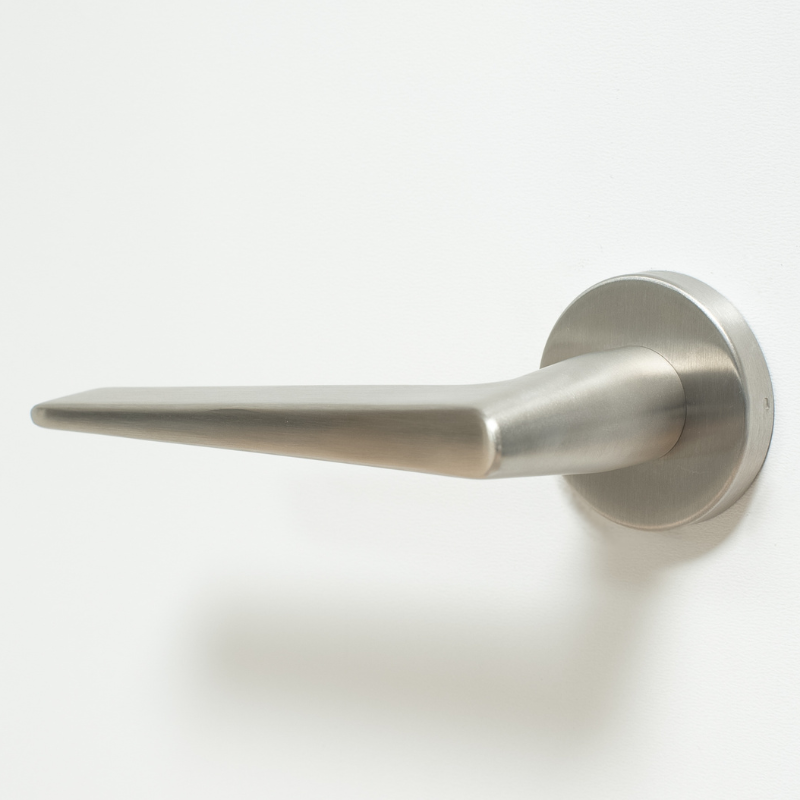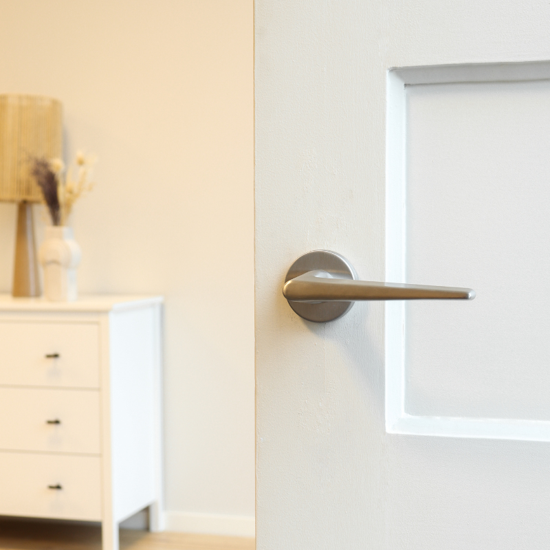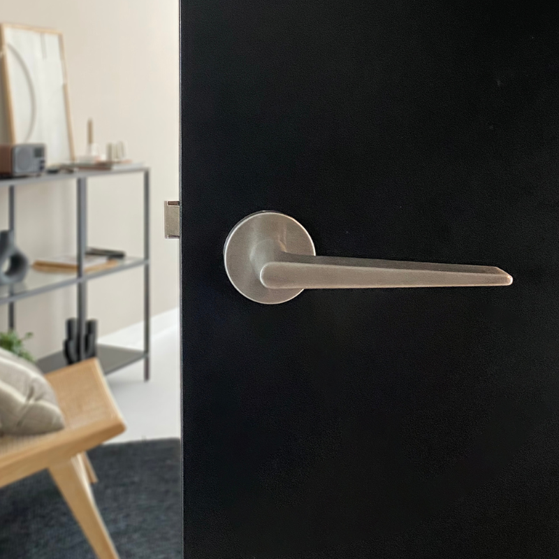 Diese Ausführung eignet sich für Standard-Innentüren ohne Schloss. Die runde Rosette sorgt für ein elegantes Finish und verleiht der Tür ein klares, modernes Aussehen. Die Oberfläche aus gebürstetem Edelstahl ist langlebig, pflegeleicht und hält dem täglichen Gebrauch problemlos stand.