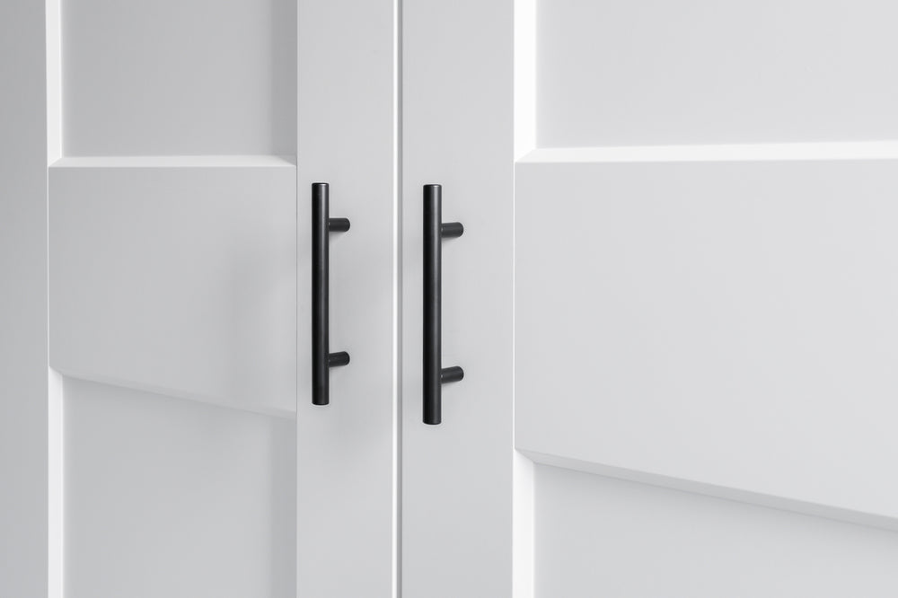 Die Montage eines Türgriffs mag zwar einfach erscheinen, doch Präzision ist für ein makelloses Ergebnis unerlässlich. Der Griff wird mit zwei Schrauben von der Innenseite der Schubladen- oder Schranktür befestigt. Achten Sie darauf, dass SieMöbelgriffDie Montage erfolgt stets im rechten Winkel und auf gleicher Höhe. Alle unsereStangengriffeDie passenden Schrauben sind im Lieferumfang enthalten. Im Zweifelsfall empfehlen wir die Verwendung einer Bohrschablone, um den exakten Lochabstand zu gewährleisten. Bohren Sie die Löcher für die Möbelschrauben mit einem 4-mm-Holzbohrer.